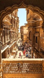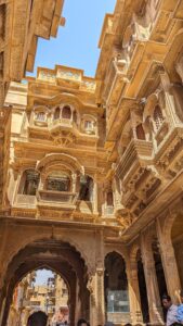 Visitaremos la Salim Singh Ki Haveli, una impresionante edificación de 300 años de antigüedad que perteneció al primer ministro del rey Maharajá Ramal Gaj Singh Salim Singh. También exploraremos la Patwon Ki Haveli, considerada la residencia más grandiosa de la ciudad. Su techo, sostenido por lujosos pilares esculpidos, y sus balcones, pasillos y dormitorios ofrecen vistas extraordinarias.